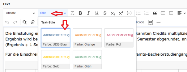 Man geht auf das Inhaltselement drauf und dann unter dem Reiter "Allgemein" geht man zum Rich-Text-Editor, wo man den Text stehen hat, wenn man den Text in einer anderen Farbe hervorheben möchte, geht man zum Bereich "Stile" und kann sich dort die entsprechende Farbe aussuchen. Ein Beispiel wäre zum Beispiel den Text in Blau hervorzuheben.