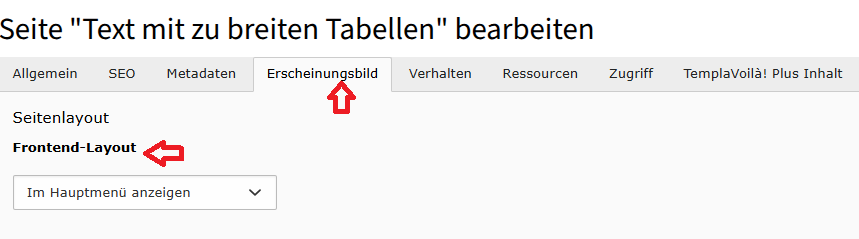 Zur Anpassung der Navigation müssen die Seiteneigenschaften einer Seite auf der Hauptebene aufgerufen werden (nicht der Inhalt).