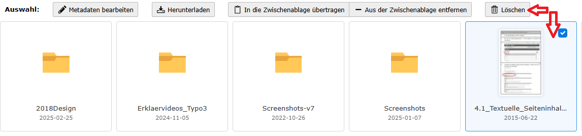 Wenn man im Ordner ist, wählt man die zu löschende Datei aus, indem man auf diese draufklickt. Dadurch ist die Datei blau markiert und oben drüber erscheint ein Löschen-Symbol. Durch das Klicken auf dieses Symbol lässt sich die Datei löschen.