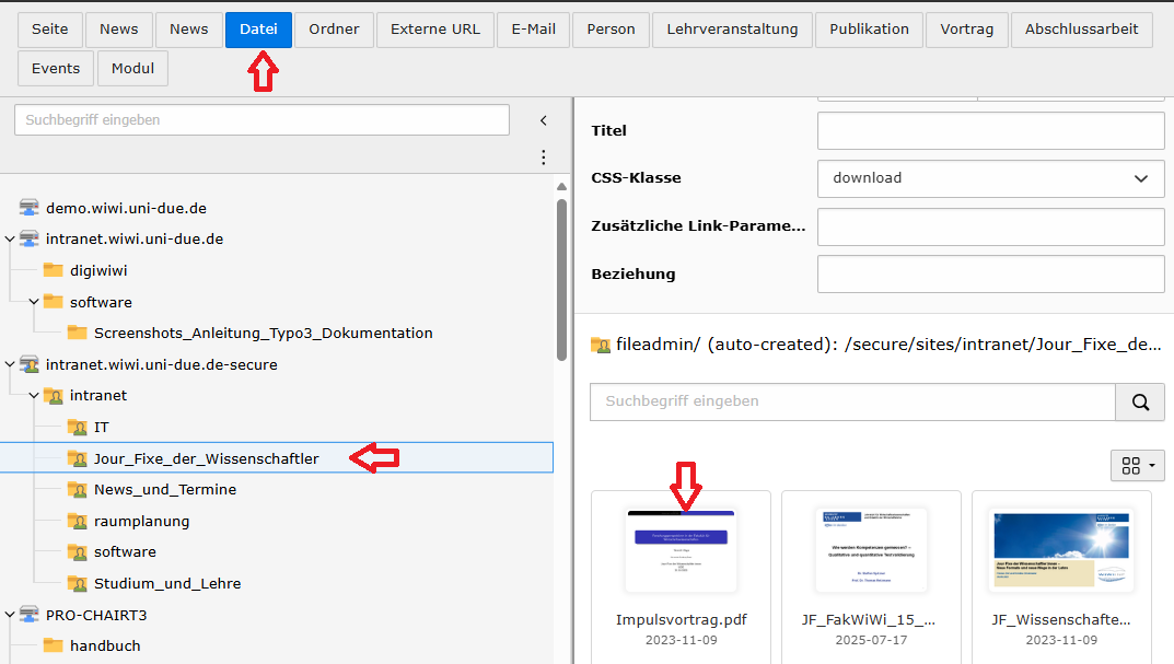 Das System bietet die Möglichkeit für Redakteure Dateien hochzuladen und für die Seitenbesucher bereitzustellen. Die Bereitstellung kann bspw. über einen Link im Text erfolgen, um auf ein PDF-Dokument zur Veranstaltungsbeschreibung zu verweisen.